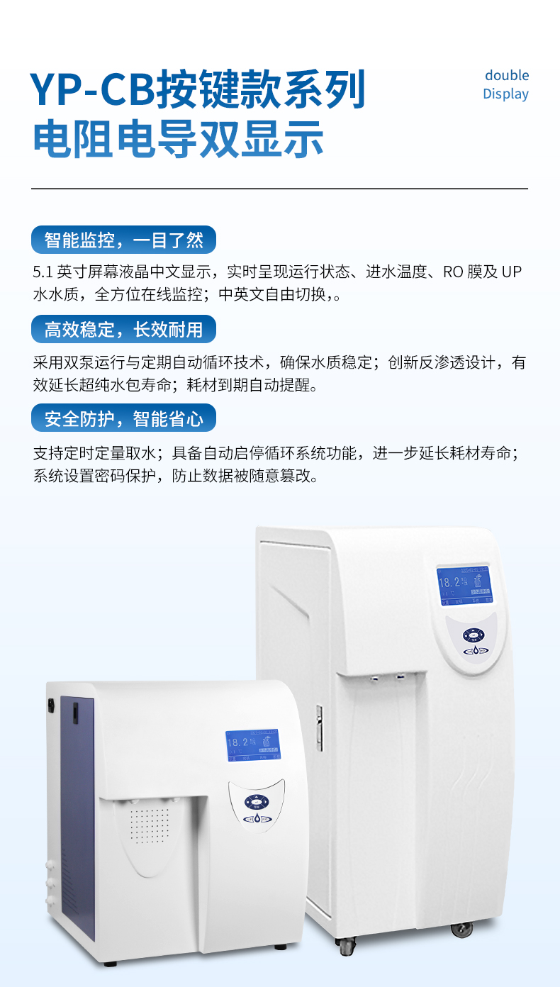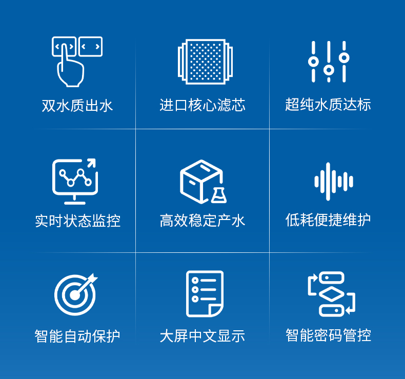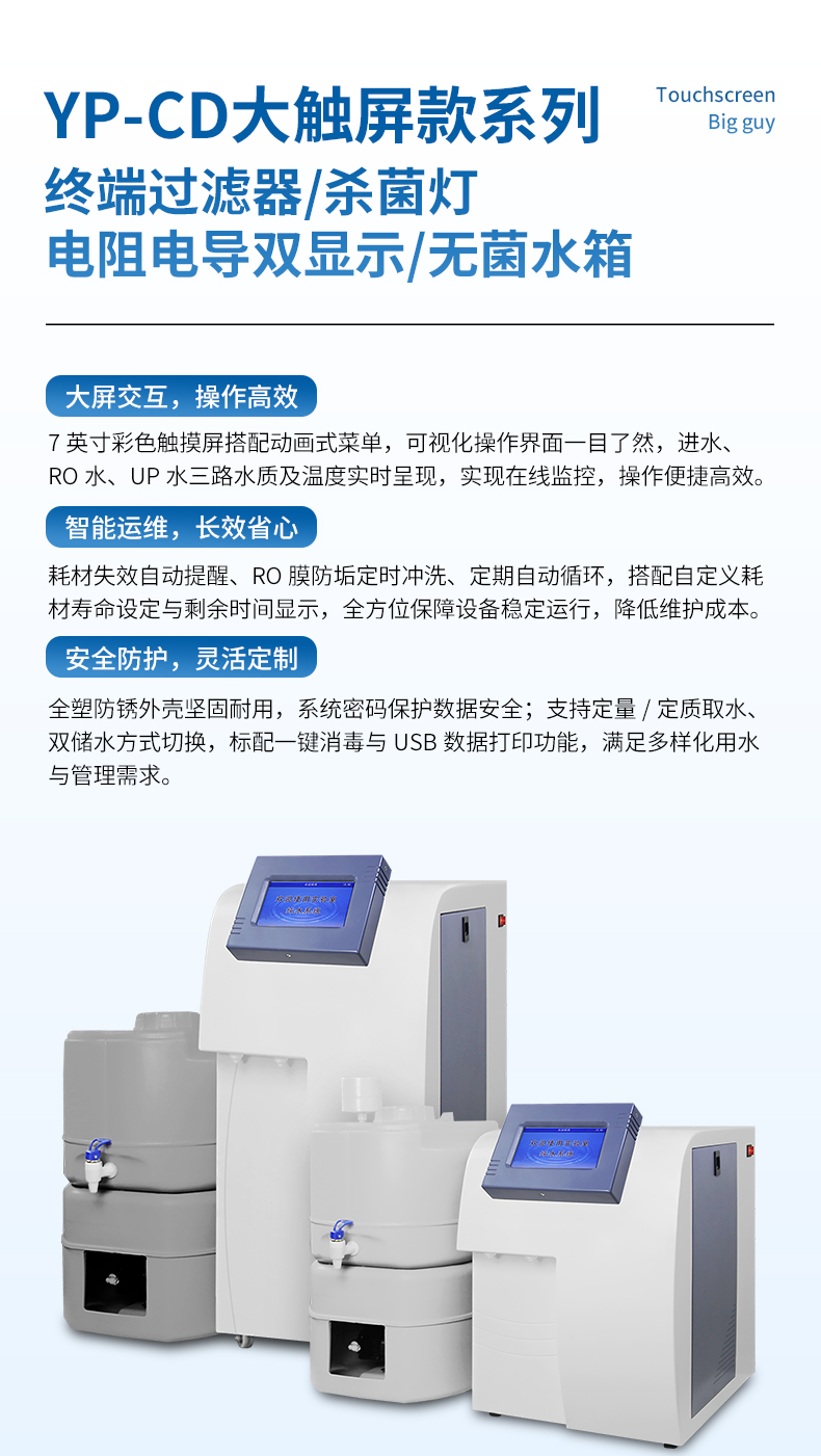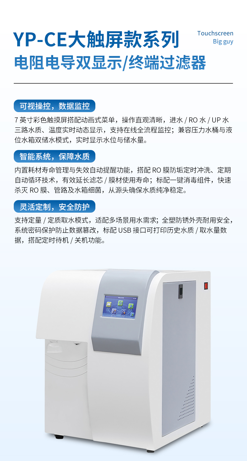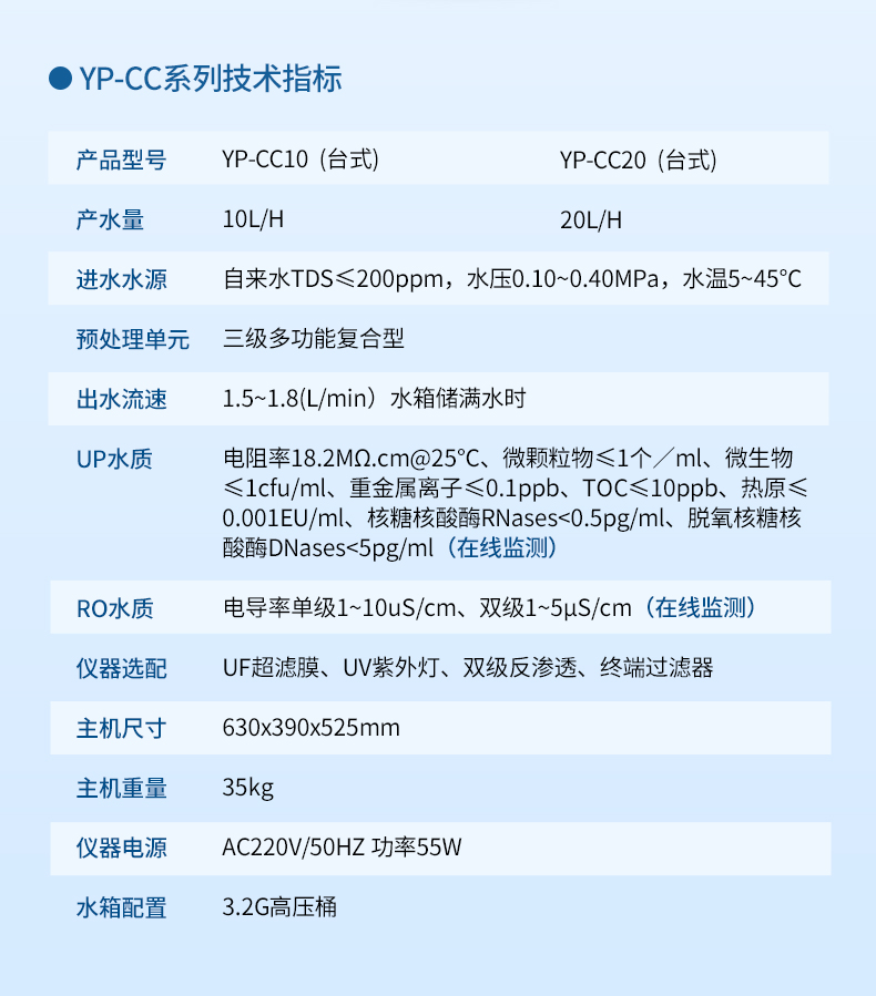 UP出水水質(zhì):電阻率18.2MΩ.cm@25℃(在線監(jiān)測)微顆粒物≤1個/ml,微生物≤1cfu/ml重金屬離子≤0.1ppb,TOC≤10ppb熱原≤0.001EU/ml,核糖核酸酶RNases<0.5pg/ml脫氧核糖核酸酶DNases<5pg/ml