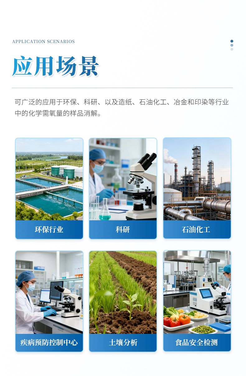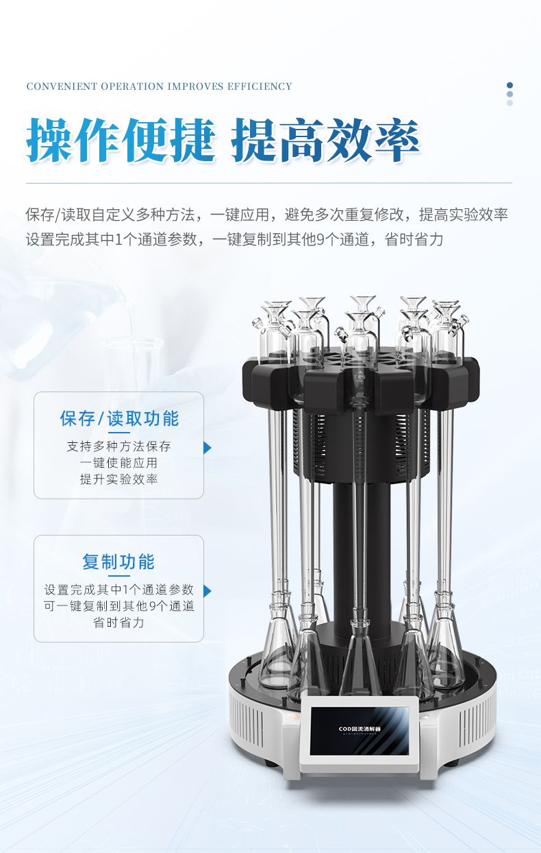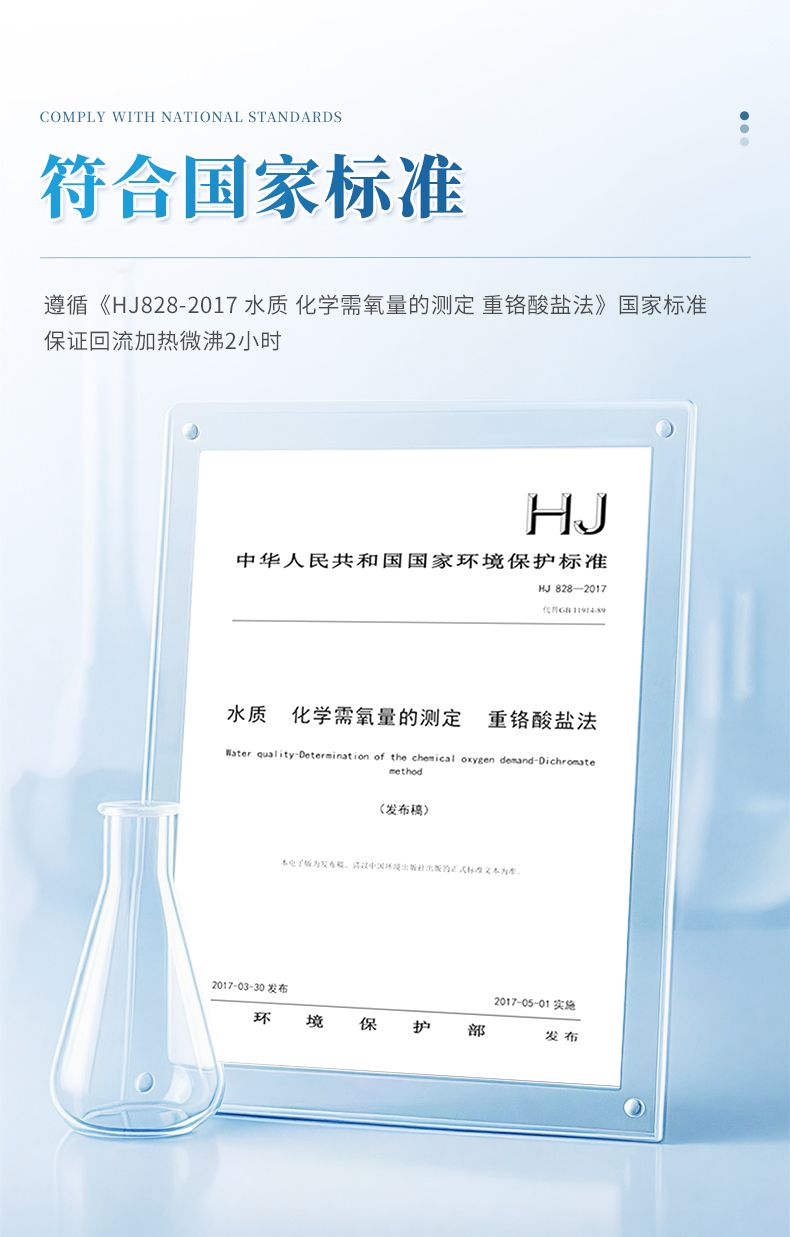 化學(xué)需氧量(COD)智能回流消解器遵循了國家標(biāo)準(zhǔn)《HJ828-2017 水質(zhì) 化學(xué)需氧量的測定 重鉻酸鹽法》的基本原則,保證了回流加熱微沸2小時(shí)的消解操作,試劑溶液的配制和加入量與國標(biāo)法一致,確??煽繙?zhǔn)確的分析結(jié)果。