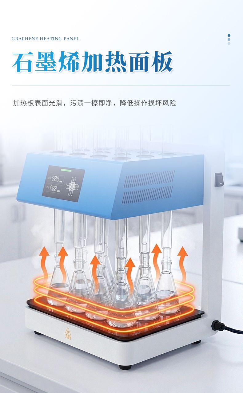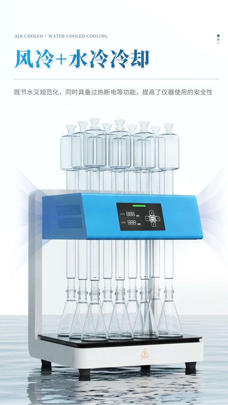 3. 安全性能優(yōu):采用玻璃毛刺回流管代替球形回流管,并以風(fēng)冷+水冷技術(shù)取代傳統(tǒng)自來(lái)水冷卻方式,既可以節(jié)水又能使儀器規(guī)范化,同時(shí)具備過(guò)熱斷電等功能,提高了儀器使用的安全性。 4.面板易清潔:采用石墨烯加熱板,表面光滑、平整,表面污漬一擦即凈,可減少操作不當(dāng)對(duì)儀器的損壞;