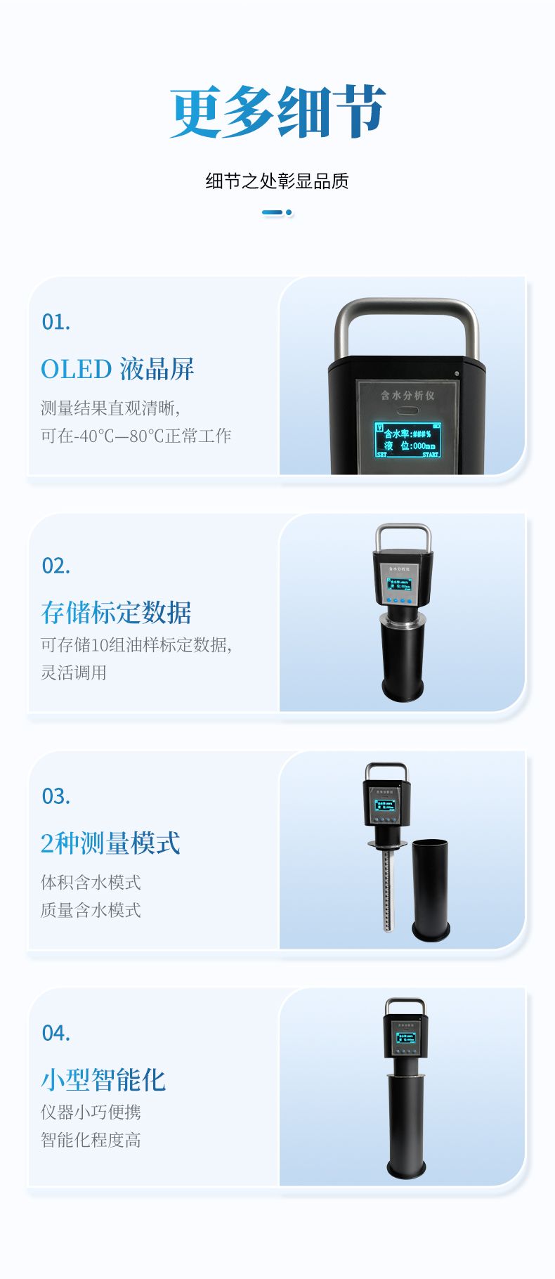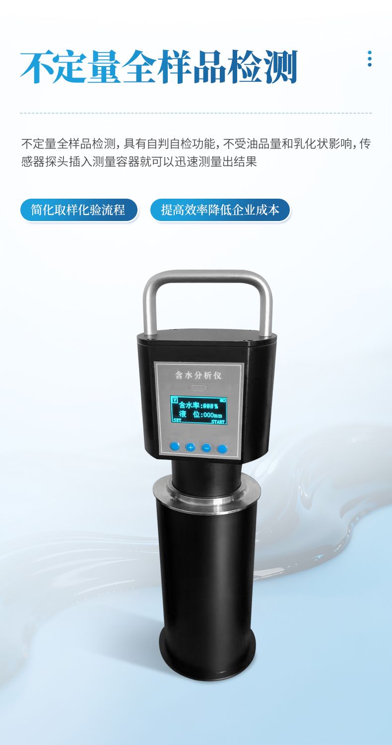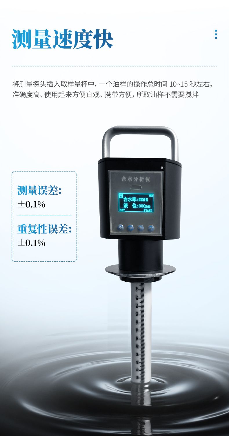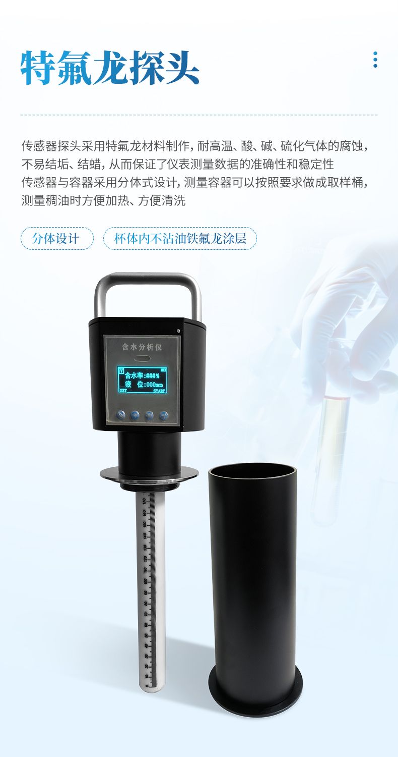 4、使用過程中省去了較耽擱時間的冷凍去明水,均勻攪拌、蒸餾、人工計算等流程。將測量探頭插入取樣量杯(量杯可以直接用取樣筒代替)中就可以迅速給出測量出結(jié)果。