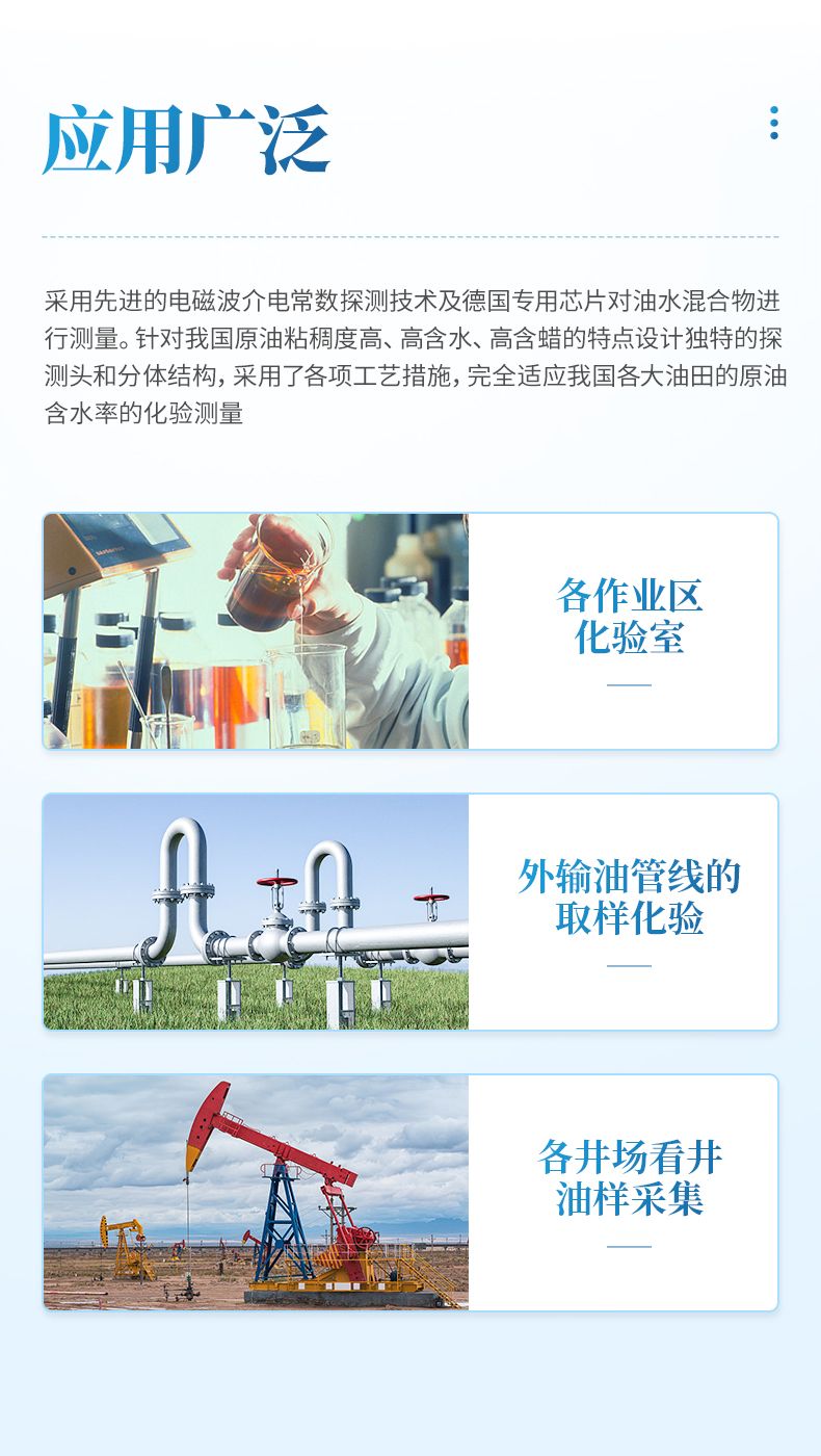 3、變定量檢測為不定量全樣品檢測,具自判自檢功能,不受油品量和乳化狀影響,不改變采油工的取樣習(xí)慣,消除了傳統(tǒng)化驗方法中的二次取樣誤差及工作流程誤差,做到了數(shù)據(jù)采集過程的零誤差,為油田生產(chǎn)決策及地質(zhì)分析提供了準確可靠的原始數(shù)據(jù),大大簡化了取樣化驗流程、大大降低了化驗員的工作強度和時間,提高了工作效率,平時5個人一天的工作量,現(xiàn)在一個人就能完成,大大降低了企業(yè)用工成本。