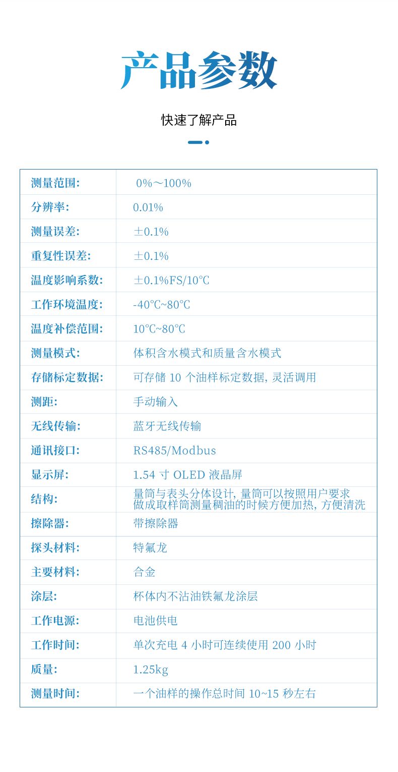 1、測量稀油的時候 10 秒就可以看結(jié)果,測量稠油時,如果是低含水 30%以下時間一般也是 10 秒左右,如果是高含水的話,測量時間盡量長一點,按實驗數(shù)據(jù)看一般 1-2 分鐘左右,具體多長時間要根據(jù)現(xiàn)場稠油的粘度來定。