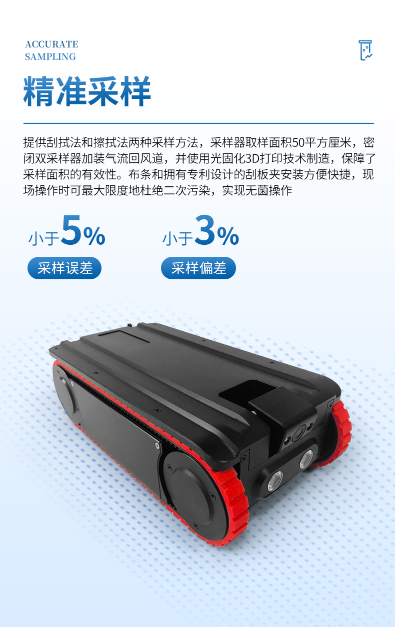 精準(zhǔn)采樣:提供刮拭法和擦拭法兩種采樣方法,采樣器取樣面積50平方厘米,密閉雙采樣器加裝氣流回風(fēng)道,并使用光固化3D打印技術(shù)制造,保障了采樣面積的有效性。布條和擁有專利設(shè)計(jì)的刮板夾安裝方便快捷,現(xiàn)場操作時(shí)可最大限度地杜絕二次污染,實(shí)現(xiàn)無菌操作。采樣誤差小于5%,采樣偏差小于3%。