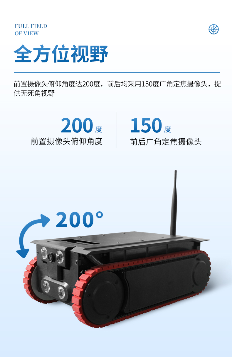 全方位視野:前置攝像頭俯仰角度達(dá)200度,前后均采用150度廣角定焦攝像頭,提供無死角視野。