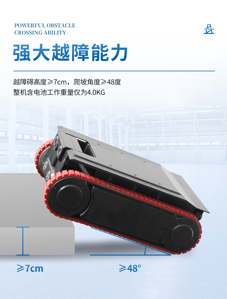 強(qiáng)大越障能力:越障礙高度≥7cm,爬坡角度≥48度,整機(jī)含電池工作重量僅為4.0KG。