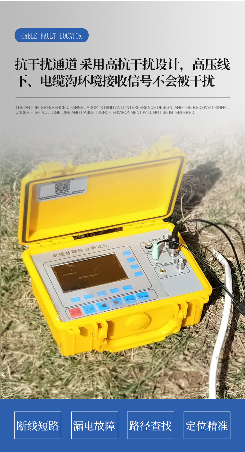 2、抗干擾通道:采用高性能濾波抗工頻干擾電路,斷電狀態(tài)下配合信號發(fā)生器定位直埋電纜對地漏電位置,測地埋電纜路徑走向及深度。