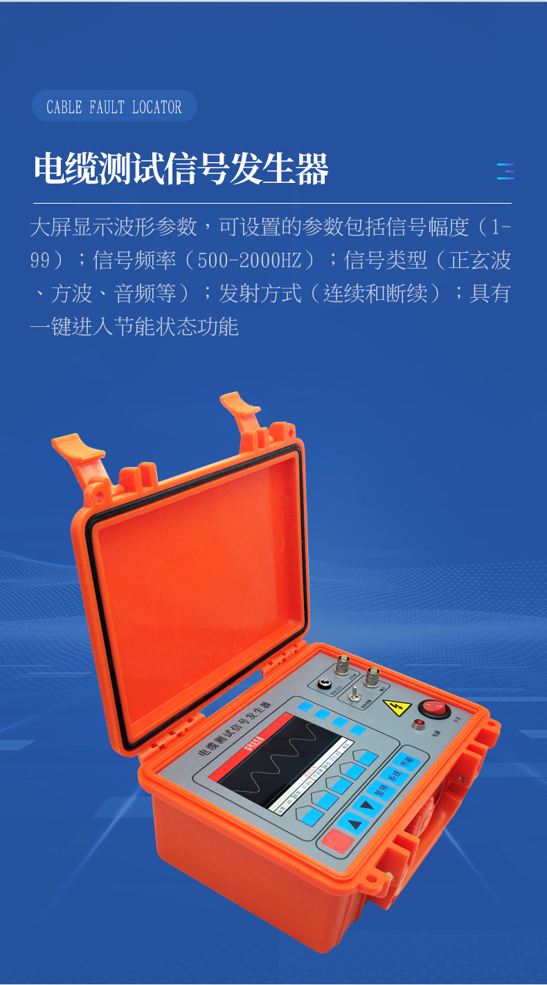 本測試儀主要用于10KV等級(可拓展至50kv)以內(nèi)的高低壓地埋電力電纜的斷線、短路、對地漏電故障( 對地絕緣電阻在0.5兆歐以內(nèi))的定位及地埋電纜深度、路徑走向的探測。