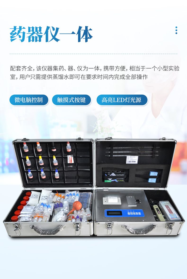 配套齊全,該儀器集藥、器、儀為一體,攜帶方便,相當(dāng)于一個(gè)小型實(shí)驗(yàn)室,用戶只需提供蒸餾水即可在要求時(shí)間內(nèi)完成全部操作。