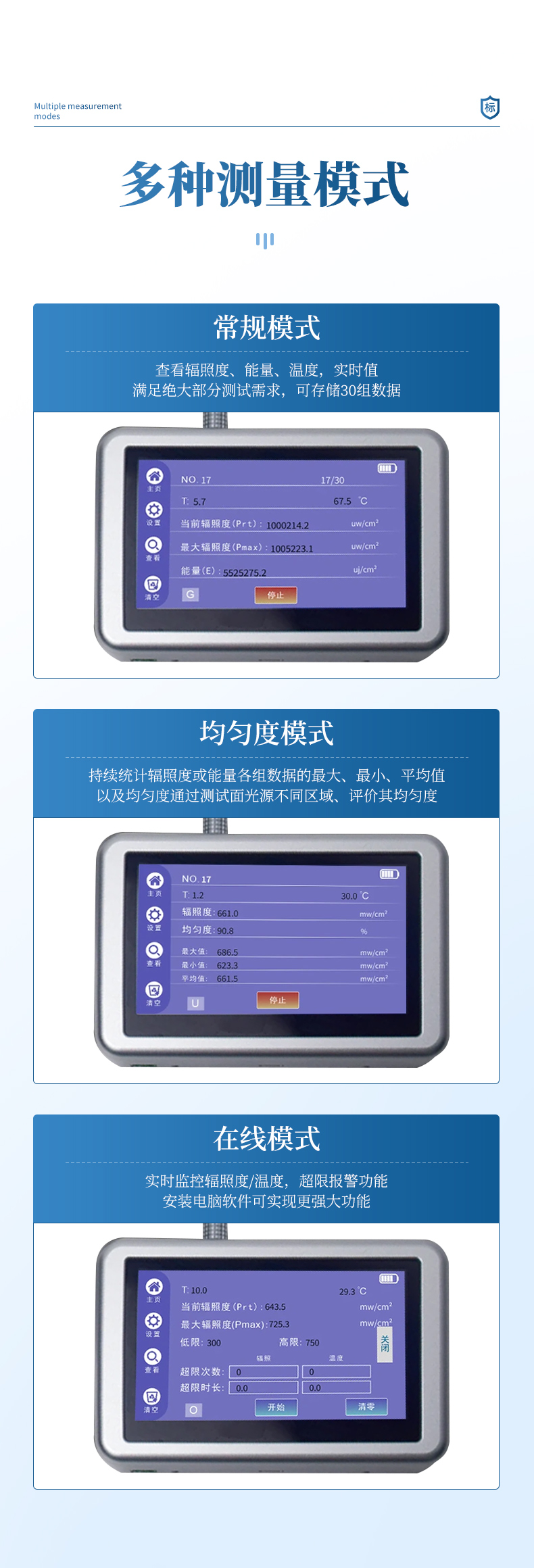 3.超大量程,量程變化量可高達(dá)10億;實(shí)時(shí)監(jiān)控輻照度/溫度,超限報(bào)警功能;