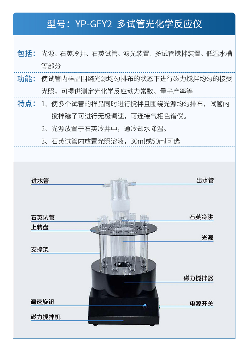 多試管+大容量反應(yīng)器包括:光源、石英冷井、石英試管、濾光裝置、多試管攪拌裝置、大容量反應(yīng)器、低溫水槽等部分。 功能:使試管內(nèi)樣品圍繞光源均勻排布的狀態(tài)下進(jìn)行磁力攪拌均勻的接受光照,可提供測(cè)定光化學(xué)反應(yīng)動(dòng)力常數(shù)、量子產(chǎn)率等 特點(diǎn):1、使多個(gè)試管的樣品同時(shí)進(jìn)行攪拌且圍繞光源均勻排布,試管內(nèi)攪拌磁子可進(jìn)行無(wú)極調(diào)速,可連接氣相色譜儀。 2、光源放置于石英冷井中,通冷卻水降溫。 3、石英試管內(nèi)放置光照溶液,30ml或50ml可選
