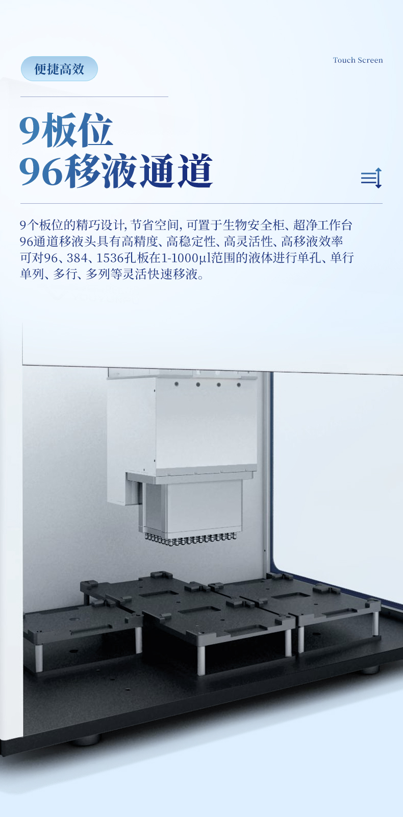 的96通道移液頭具有高精度、高穩(wěn)定性、高靈活性、高移液效率,可對(duì)96、384、1536孔板在1-1000μl范圍的液體進(jìn)行單孔、單行、單列、多行、多列等靈活快速移液。