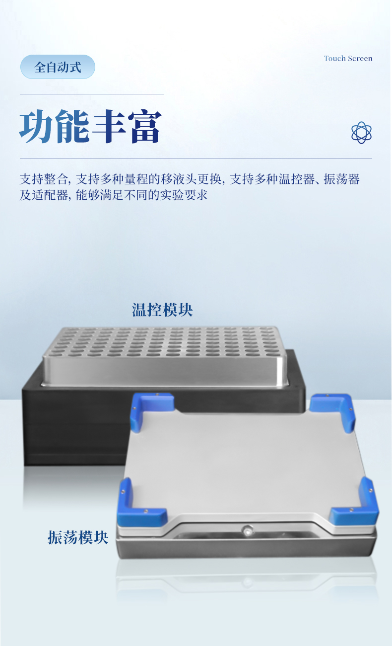 功能豐富,即可單獨(dú)使用也支持整合在自動(dòng)化實(shí)驗(yàn)室中,單獨(dú)使用時(shí)可搭載多種模塊,如:振蕩器、溫控模塊、磁力架、溫控模塊等
