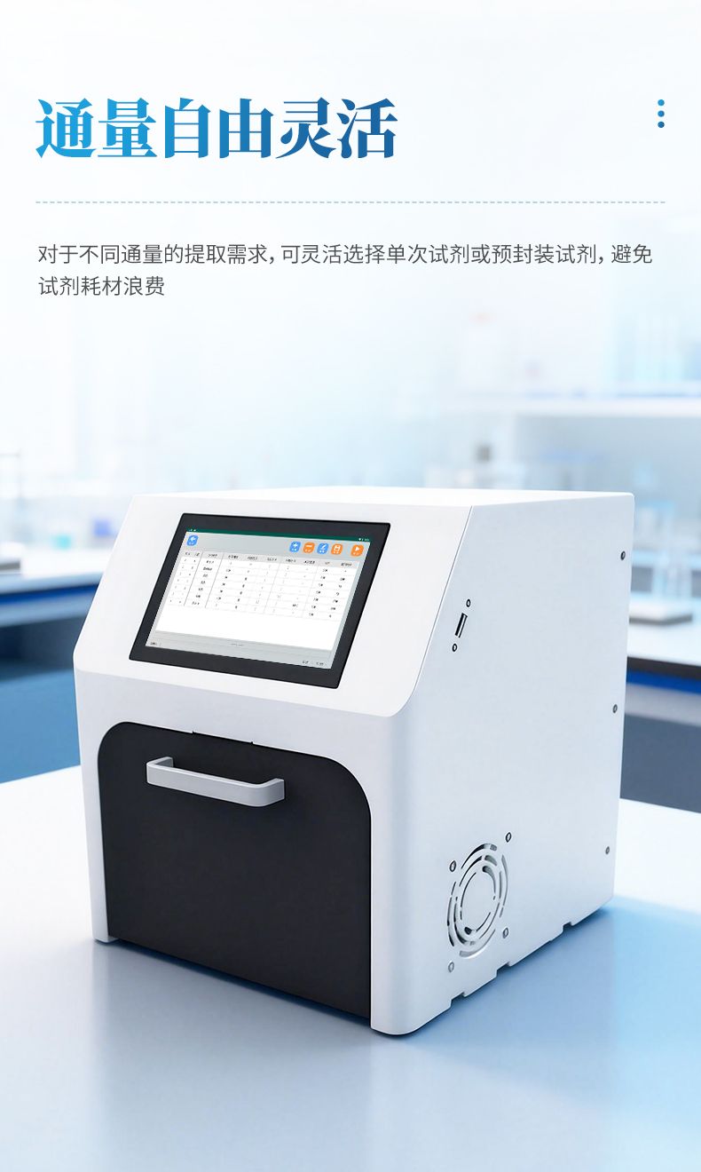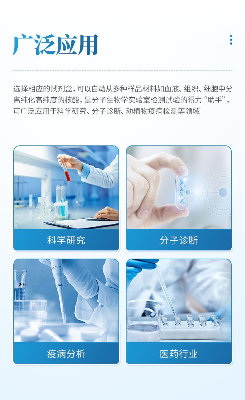 核酸提取儀通過磁珠法提取核酸,選擇相應(yīng)的試劑盒就可以自動的從多種樣品材料如血液、組織、細胞中分離純化高純度的核酸。具有兼容性強(適配預(yù)封裝提取試劑盒,也可適配單頭份試劑)、提取速度快、提取回收率高、操作簡便的優(yōu)點,是分子生物學(xué)實驗室檢測試驗的得力“助手”??蓮V泛應(yīng)用于科學(xué)研究、分子診斷、動植物疫病檢測等領(lǐng)域。