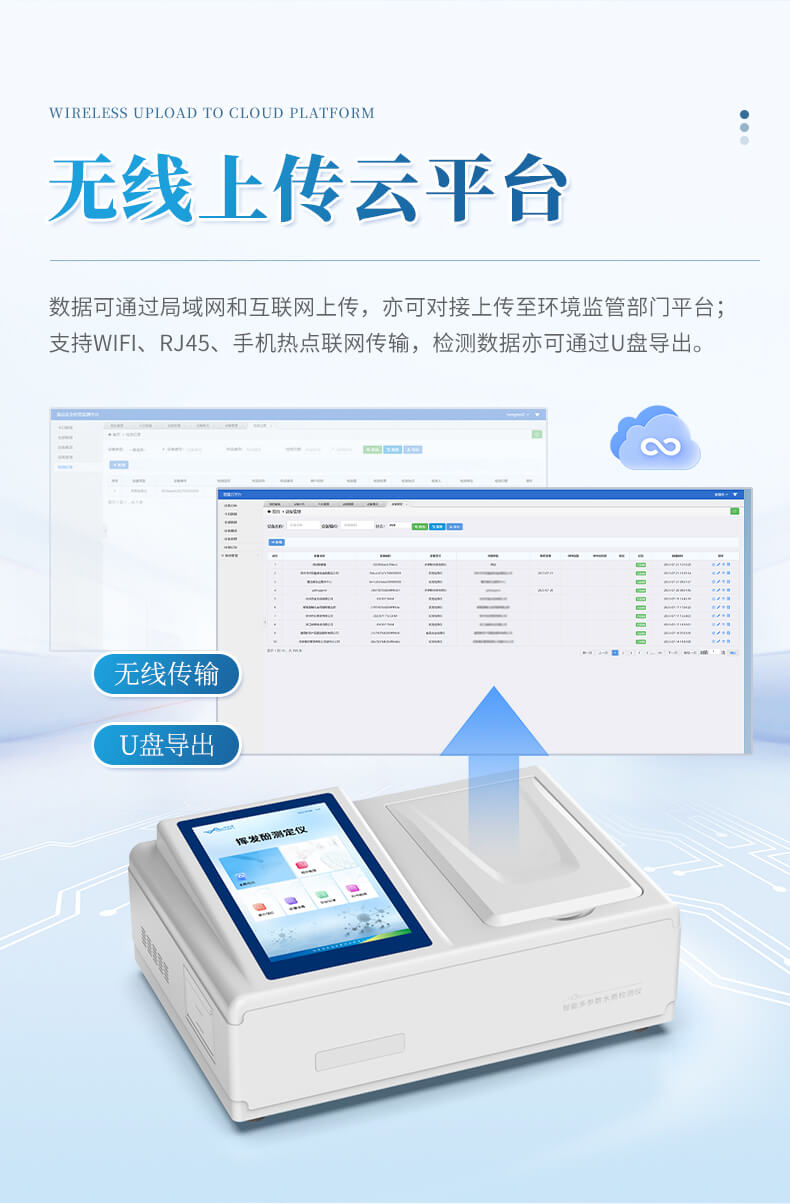 云平臺:儀器帶有監(jiān)管平臺,連接有線/無線網(wǎng)絡(luò),檢測結(jié)果直接傳輸至環(huán)境安全監(jiān)管平臺;