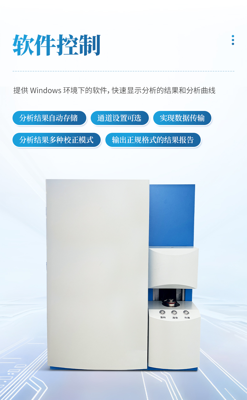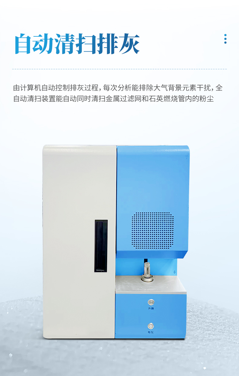 由計算機自動控制排灰過程。每次分析能排除大氣背景元素干擾,有效消除空氣中水分對硫的影響。每次分析結(jié)束自動正壓脈沖排塵,把燃燒產(chǎn)生的大部分氧化物粉塵排出機外。該機構(gòu)運行穩(wěn)定可靠,已經(jīng)歷過 10 多年的時間考驗。全自動清掃裝置能自動同時清掃金屬過濾網(wǎng)和石英燃燒管內(nèi)的粉塵,可大幅度提高