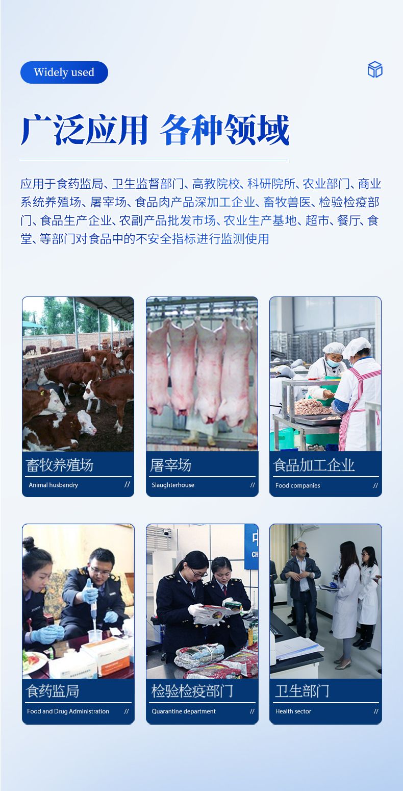 該儀器廣泛應(yīng)用于食藥監(jiān)局、衛(wèi)生監(jiān)督部門、高教院校、科研院所、農(nóng)業(yè)部門、商業(yè)系統(tǒng)養(yǎng)殖場(chǎng)、屠宰場(chǎng)、食品肉產(chǎn)品深加工企業(yè)、畜牧獸醫(yī)、檢驗(yàn)檢疫部門、食品生產(chǎn)企業(yè)、農(nóng)副產(chǎn)品批發(fā)市場(chǎng)、農(nóng)業(yè)生產(chǎn)基地、超市、餐廳、食堂、等單位部門對(duì)食品中的不安全指標(biāo)進(jìn)行監(jiān)測(cè)使用。