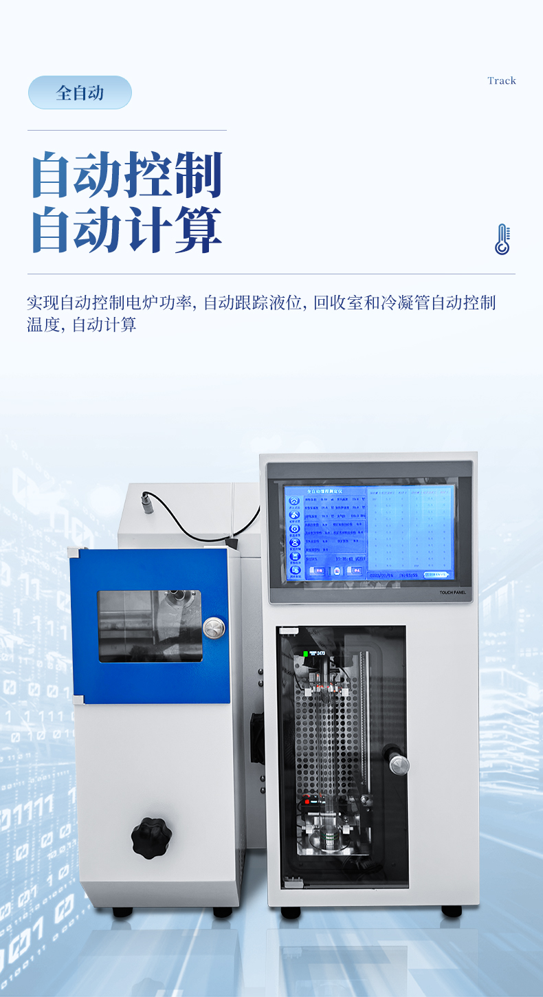 8.儀器實(shí)現(xiàn)自動(dòng)控制電爐功率,自動(dòng)跟蹤液位,回收室和冷凝管自動(dòng)控制溫度,自動(dòng)計(jì)算。
