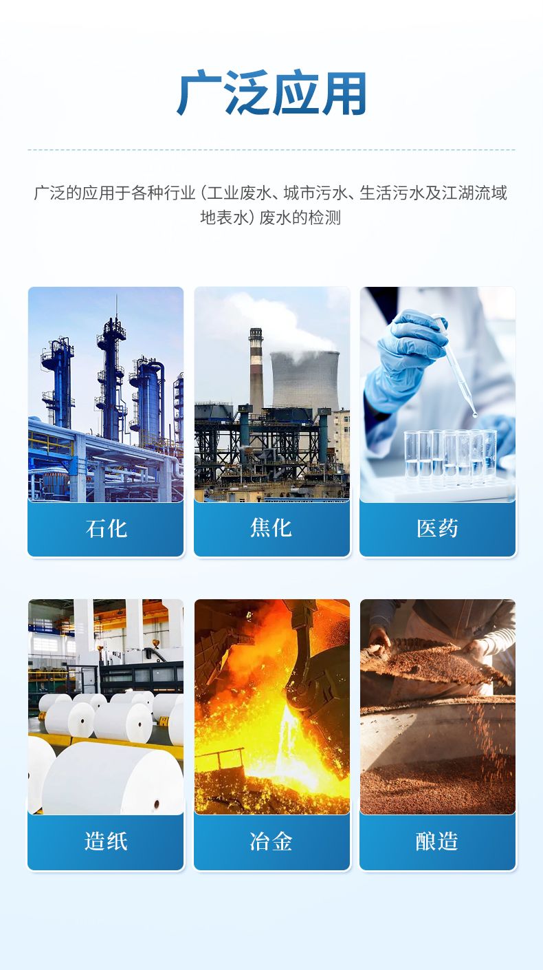 能夠廣泛的應(yīng)用于各種行業(yè)(工業(yè)廢水、城市污水、生活污水及江湖流域地表水)廢水的檢測,可適合不同用戶的多種需求,可在化工、石油、焦化、造紙、冶金、釀造、醫(yī)藥等工業(yè)廢水及各種生活污水監(jiān)測應(yīng)用。