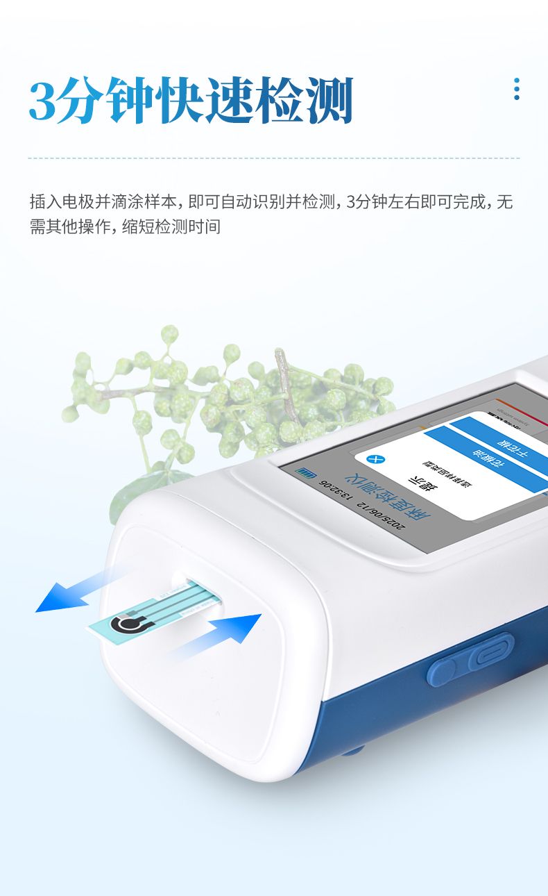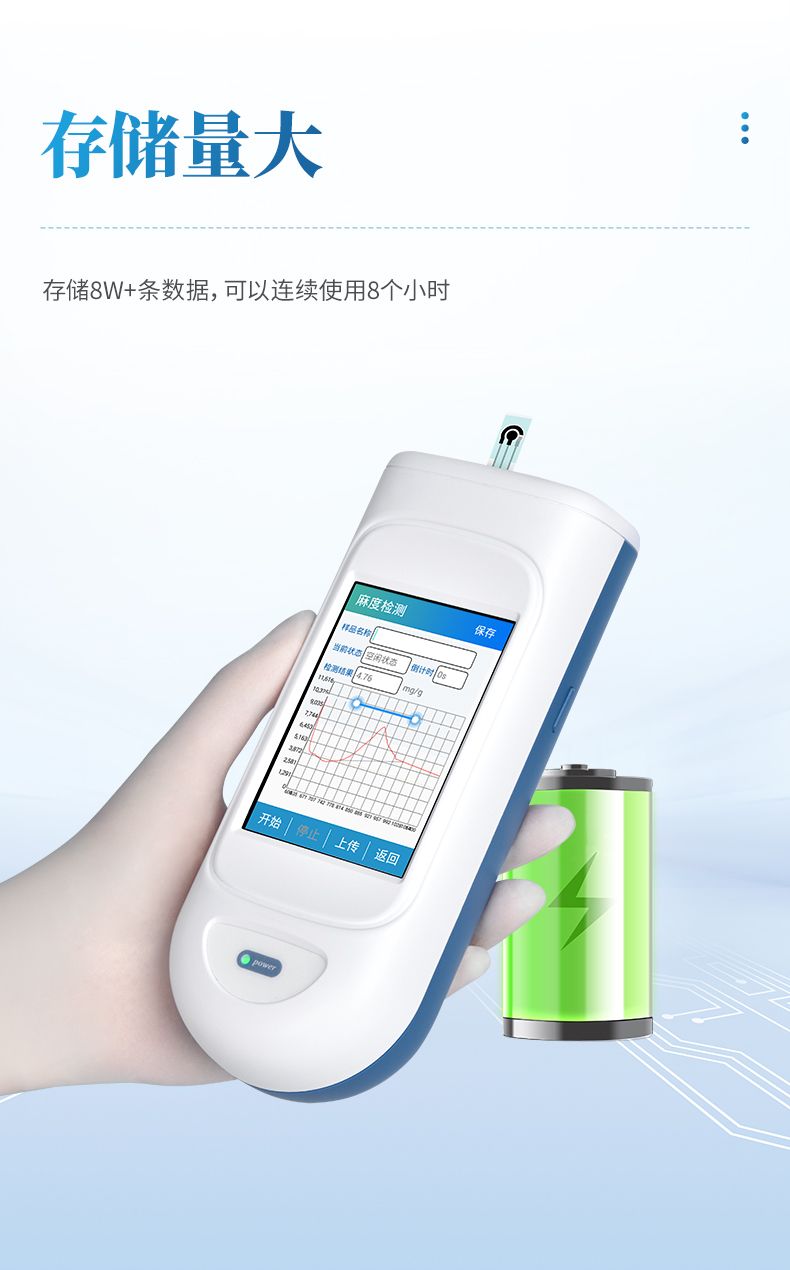 麻度檢測儀采用一次性三電極片在電位作用下,椒素在工作電極表面富集,然后在工作電壓下得失電子,發(fā)生氧化還原反應,這時電流信號在顯示器上呈現(xiàn)相應的氧化還原峰,根據(jù)峰電流的大小對花椒酰胺的含量進行定量分析。