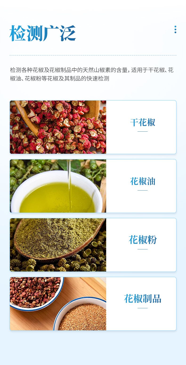 1. 樣品檢測范圍:花椒5-30mg/g 花椒油 0.6-3mg/g;
