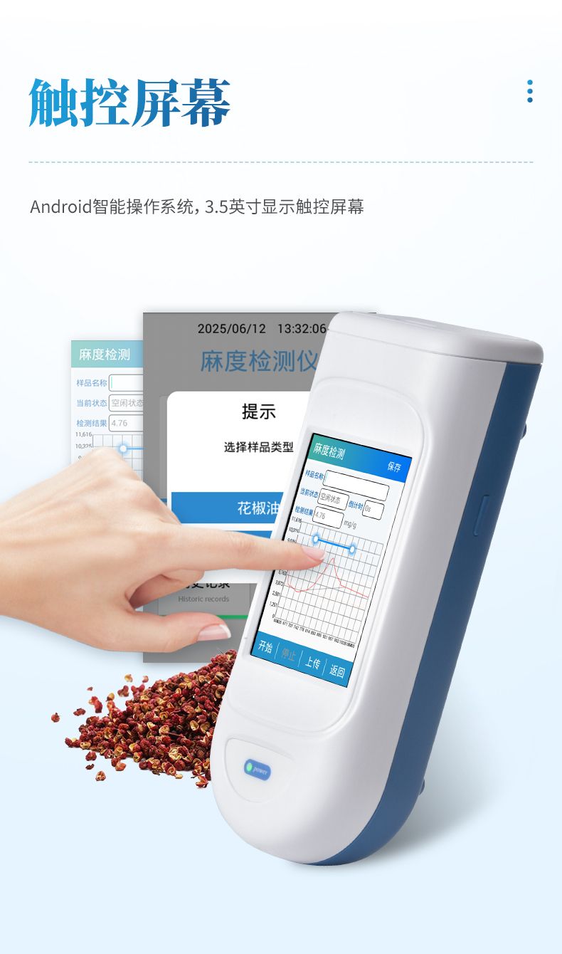 手持式麻度檢測儀采用電化學測量方法,可快速、便捷地檢測各種花椒及花椒制品中的天然山椒素的含量,適用于干花椒、花椒油、花椒粉等花椒及其制品的快速檢測。