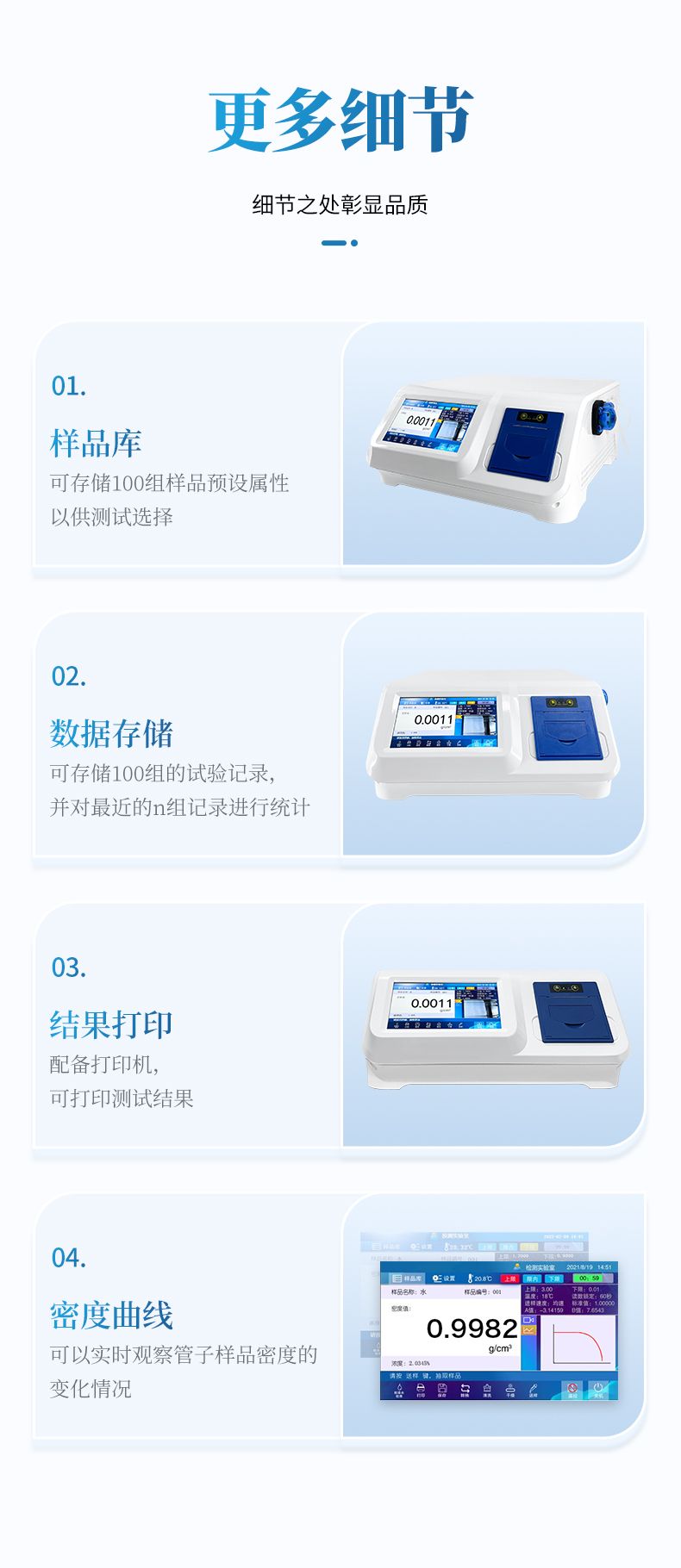 恒溫電子式液體密度計還能配合相應液體的密度濃度轉(zhuǎn)換軟件,直接讀出濃度值。并且有校準、采樣、恒溫控制、測試、清理、干燥、操作提示、觀察窗、密度曲線、樣品庫、數(shù)據(jù)儲存、數(shù)據(jù)統(tǒng)計、結(jié)果打印等功能,使用和保養(yǎng)更加方便。