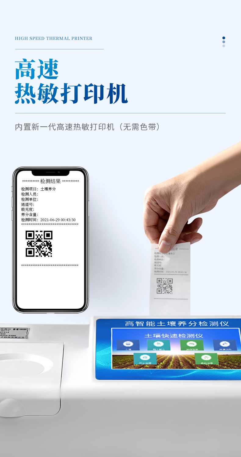 14、內(nèi)置新一代高速熱敏打印機(jī)(無需色帶),打印內(nèi)容包含:檢測單位、檢測人員、檢測項(xiàng)目、通道號(hào)、吸光度、養(yǎng)分含量(mg/kg)、檢測時(shí)間、以及二維碼等信息