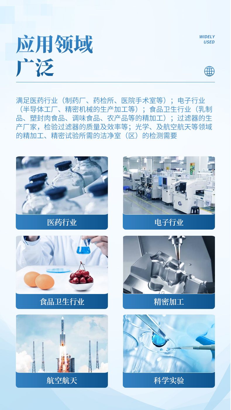 滿足醫(yī)藥行業(yè)(制藥廠、藥檢所、醫(yī)院手術(shù)室等);電子行業(yè)(半導(dǎo)體工廠、精密機(jī)械的生產(chǎn)加工等);食品衛(wèi)生行業(yè)(乳制品、塑封肉食品、調(diào)味食品、農(nóng)產(chǎn)品等的精加工);過濾器的生產(chǎn)廠家,檢驗(yàn)過濾器的質(zhì)量及效率等;光學(xué)、及航空航天等領(lǐng)域的精加工、精密試驗(yàn)所需的潔凈室(區(qū))的檢測(cè)需要。