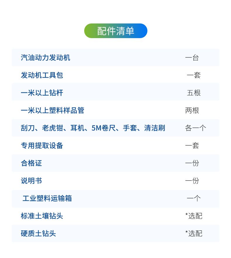汽油動力發(fā)動機一臺,發(fā)動機工具包一套,標準土壤鉆頭、硬質(zhì)土鉆頭隨意選配,不小于1米的鉆桿5根、不小于1米的塑料樣品管2根,刮刀、老虎鉗、耳機、5M卷尺、手套、清潔刷各1個,專用提取設(shè)備1套、工業(yè)塑料運輸箱1個