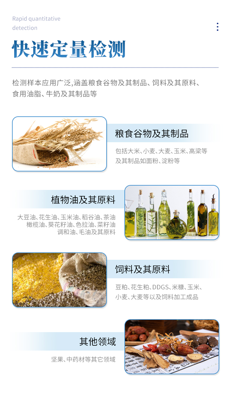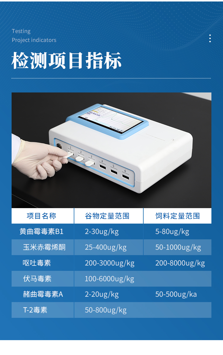 YP-L03P型真菌毒素快速檢測儀采用熒光定量快速檢測原理,主要檢測糧油谷物及飼料中真菌毒素和重金屬含量,包括黃曲霉毒素、玉米赤霉烯酮、嘔吐毒素、伏馬毒素、赭曲霉毒素、T-2毒素、重金屬鎘、重金屬鉛等等,檢測樣品涵蓋糧食谷物(大米、玉米、小麥、大麥、高粱等)及其制品、飼料及其原料、食用油脂、牛奶及其制品等;樣品前處理簡單,整個檢測過程檢測12min,產(chǎn)品適用于地方糧庫、谷物生產(chǎn)企業(yè)、飼料廠、各類畜牧養(yǎng)殖企業(yè)、面粉廠、食品加工廠、第三方檢測機構(gòu)及各級政府監(jiān)管部門。