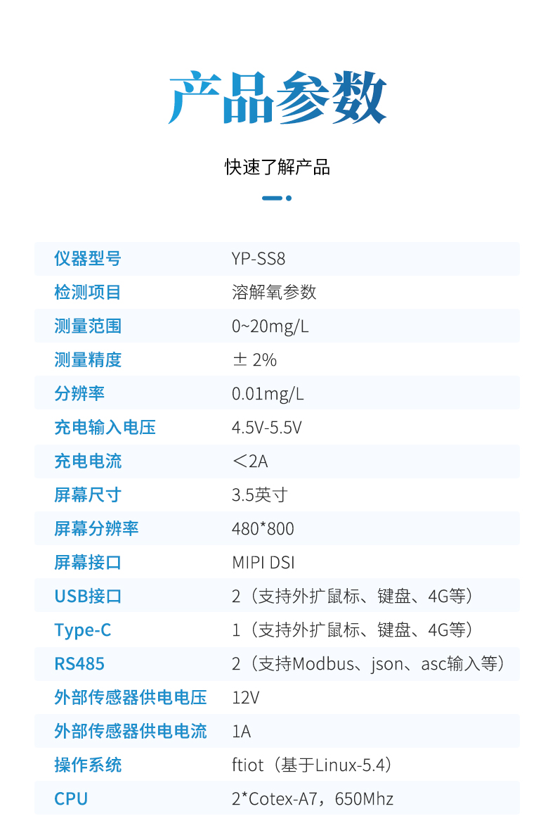 | 9 | 溶解氧 | 0~20mg/L | 熒光壽命法 | ± 2% | 0.01mg/L | ? | |