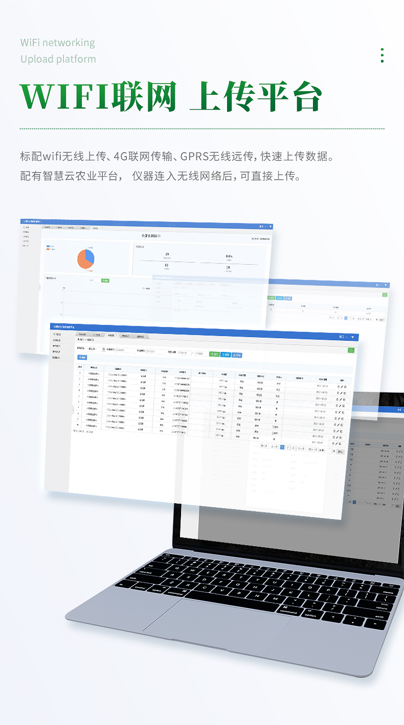★13、配有智慧云農(nóng)業(yè)平臺(tái),儀器連入無(wú)線網(wǎng)絡(luò)后,可將檢測(cè)數(shù)據(jù)可選擇性或批量無(wú)線上傳,方便用戶進(jìn)行數(shù)據(jù)管理和長(zhǎng)期分析。
