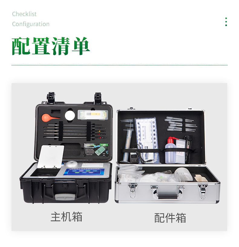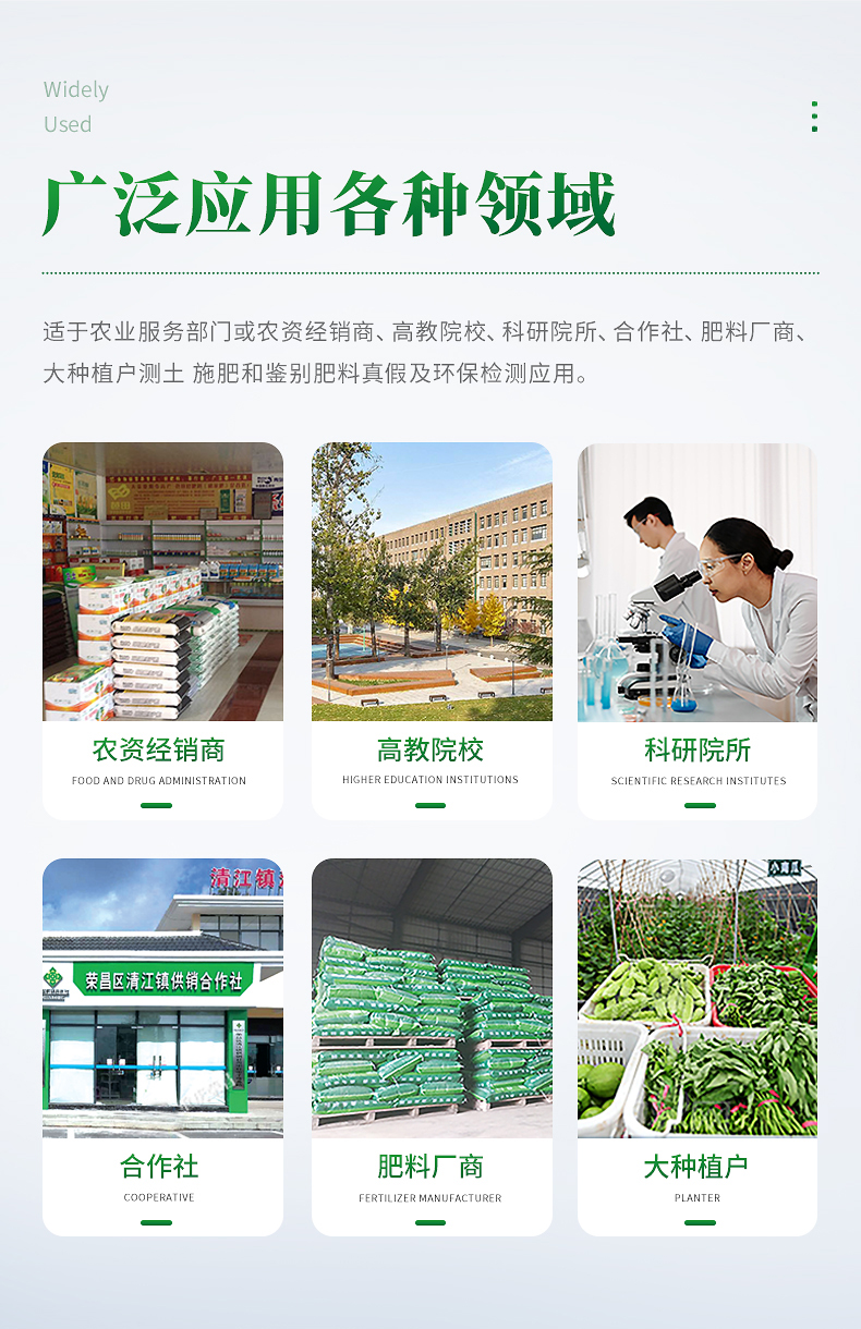 配套齊全:該儀器集藥、器、儀為一體,攜帶方便,相當(dāng)于一個(gè)小型移動(dòng)實(shí)驗(yàn)室,無需用戶自配附件,亦可靈活野外流動(dòng)測(cè)試。適于農(nóng)業(yè)服務(wù)部門或農(nóng)資經(jīng)銷商、高教院校、科研院所、合作社、肥料廠商、大種植戶測(cè)土施肥和鑒別肥料真假及環(huán)保檢測(cè)應(yīng)用。