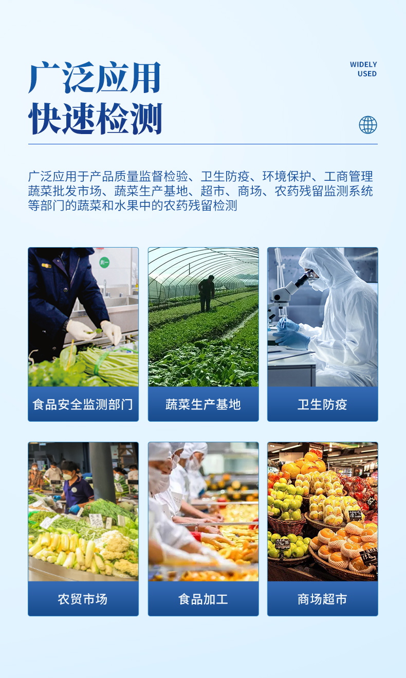 它可以廣泛應(yīng)用于產(chǎn)品質(zhì)量監(jiān)督檢驗、衛(wèi)生防疫、環(huán)境保護、工商管理、蔬菜批發(fā)市場、蔬菜生產(chǎn)基地、超市、商場、農(nóng)藥殘留監(jiān)測系統(tǒng)等部門的蔬菜和水果中的農(nóng)藥殘留檢測。