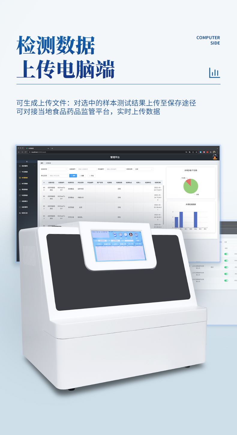 軟件:可生成上傳文件:對選中的樣本測試結(jié)果上傳至保存途徑??蓪赢?shù)厥称匪幤繁O(jiān)管平臺,實時上傳數(shù)據(jù)。