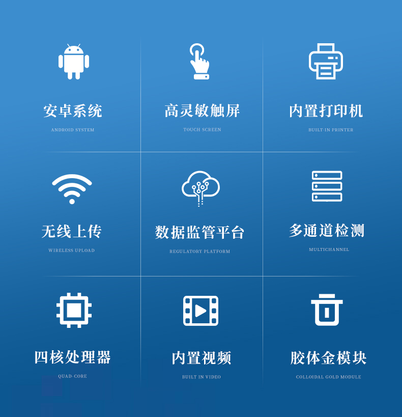 【產(chǎn)品簡介】智能安卓操作系統(tǒng),帶膠體金檢測模塊,內(nèi)置國家限量標準,18通道檢測
