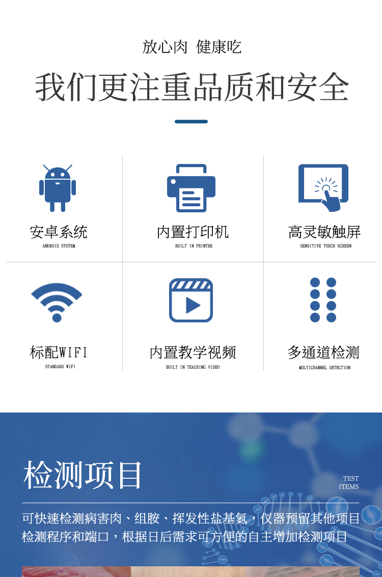 可快速檢測(cè)病害肉、組胺、揮發(fā)性鹽基氮,儀器預(yù)留其他項(xiàng)目檢測(cè)程序和端口,根據(jù)日后需求可方便的自主增加檢測(cè)項(xiàng)目。
