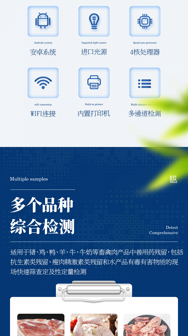 該設(shè)備可快速檢測(cè)肌肉組織(魚、蝦等水產(chǎn)類)中的氯霉素殘留,氯霉素快速檢測(cè)卡整個(gè)檢測(cè)過(guò)程只需要30分鐘左右, 靈敏度為 0.3 μg/kg (ppb),該設(shè)備還可應(yīng)用于四環(huán)素類、硝基呋喃類、磺胺類、沙星類、孔雀石綠等快速檢測(cè)。