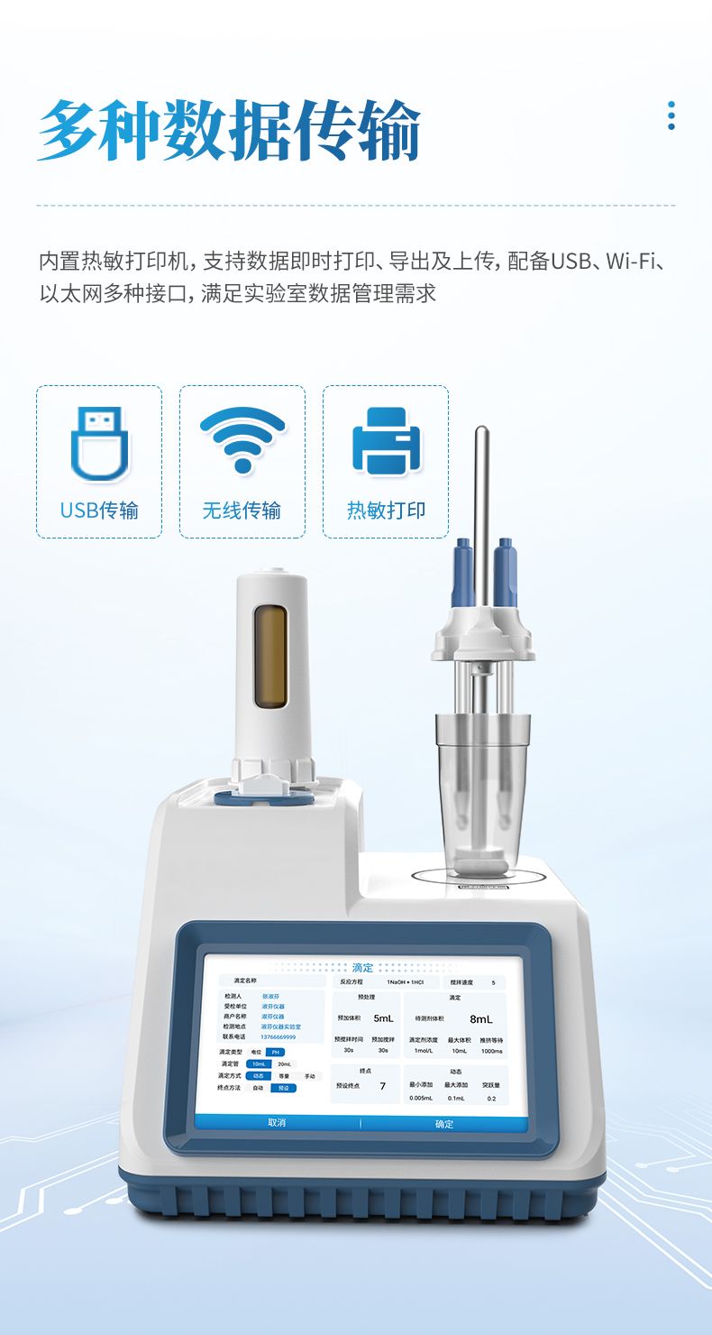 7.大容量本地存儲器,完整保存檢測數據及滴定曲線,內置熱敏打印機可即時打印檢測數據;