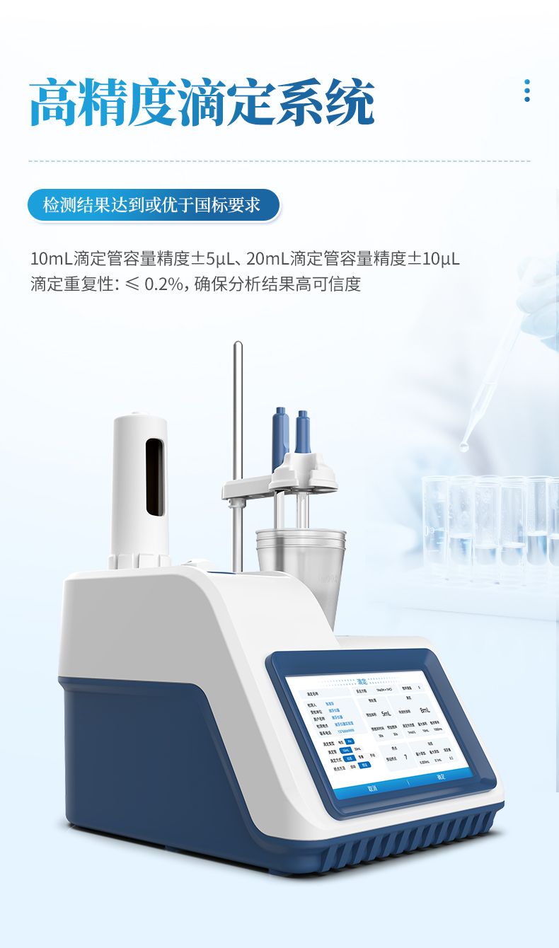 2.高精度滴定系統,檢測結果達到或優(yōu)于國標要求。支持滴定管快速更換,維護便捷;