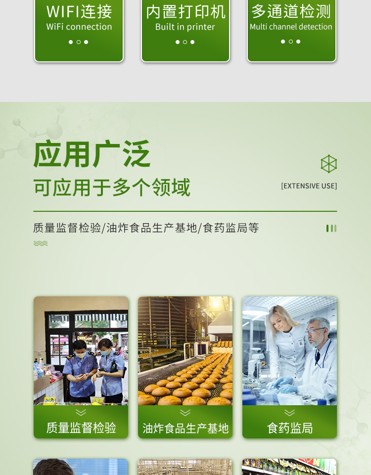 廣泛應(yīng)用于質(zhì)量監(jiān)督檢驗、工商管理、油炸食品生產(chǎn)基地、食藥監(jiān)局、衛(wèi)生部門、肉制品食品深加工企業(yè)、商場超市、各大食品安全監(jiān)測系統(tǒng)等單位使用。