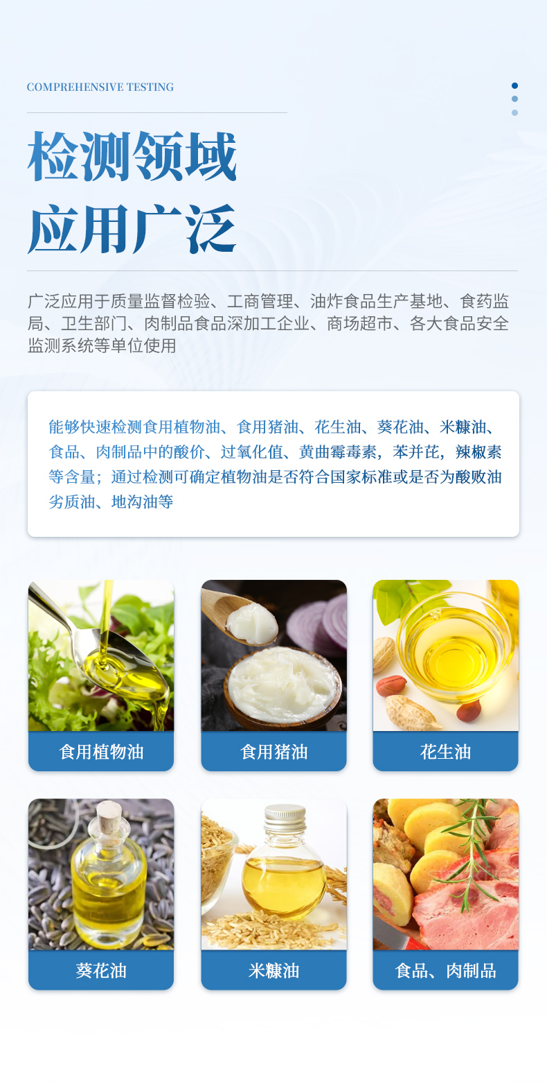 廣泛應(yīng)用于質(zhì)量監(jiān)督檢驗(yàn)、工商管理、油炸食品生產(chǎn)基地、食藥監(jiān)局、衛(wèi)生部門、肉制品食品深加工企業(yè)、商場(chǎng)超市、各大食品安全監(jiān)測(cè)系統(tǒng)等單位使用。