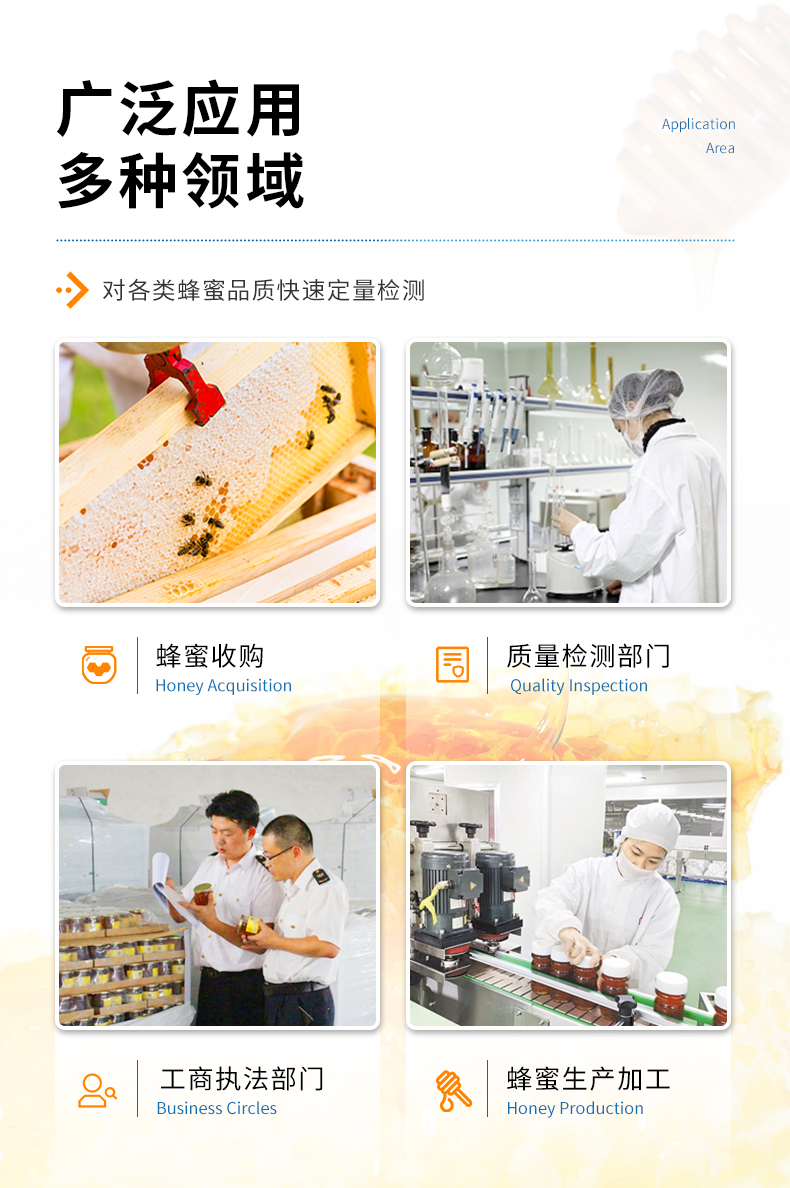 檢測(cè)項(xiàng)目:蜂蜜蔗糖、蜂蜜還原糖(葡萄糖和果糖)、蜂蜜羥甲基糠醛、蜂蜜酸度、蜂蜜中農(nóng)藥殘留、蜂蜜淀粉酶值、蜂蜜中脯氨酸、蜂蜜水分、蜂蜜糖分、蜂蜜中重金屬(鉛、鎘、汞)、蜂蜜中抗生素(氯霉素、四環(huán)素、磺胺類、呋喃類、喹諾酮類)、蜂蜜中灰分,應(yīng)用范圍:應(yīng)用于現(xiàn)場(chǎng)檢測(cè)蜂蜜蔗糖、葡萄糖和果糖、羥甲基糠醛、酸度、農(nóng)殘、淀粉酶、脯氨酸、水分、糖分、重金屬、抗生素、灰分含量的蜂蜜快速檢測(cè)儀,可廣泛應(yīng)用于各類蜂蜜品質(zhì)的快速定量檢測(cè)。