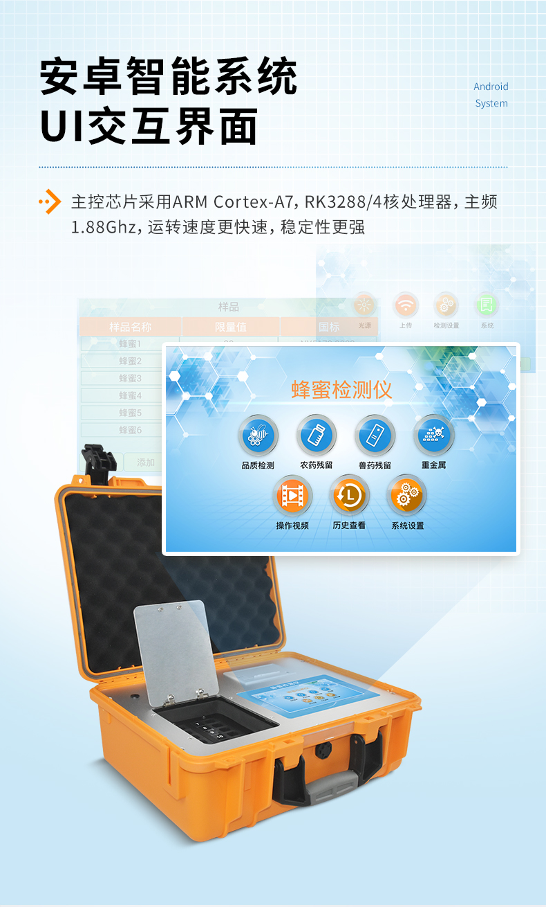 【產(chǎn)品簡(jiǎn)介】智能安卓操作系統(tǒng),帶膠體金檢測(cè)模塊,內(nèi)置國(guó)家限量標(biāo)準(zhǔn)和操作視頻。