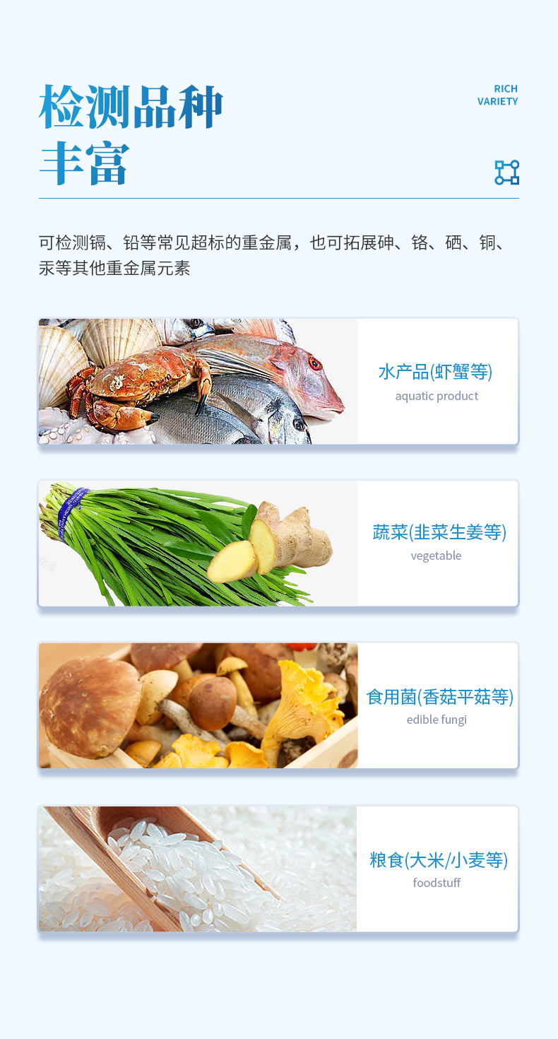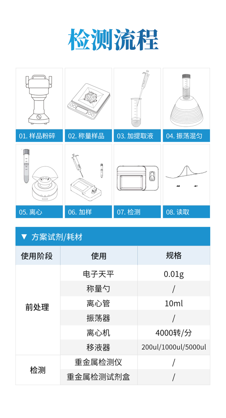 5、應(yīng)用范圍廣,同時適用于農(nóng)產(chǎn)品、水產(chǎn)品、加工食品的重金屬現(xiàn)場或?qū)嶒炇铱焖俜治觥?/p>