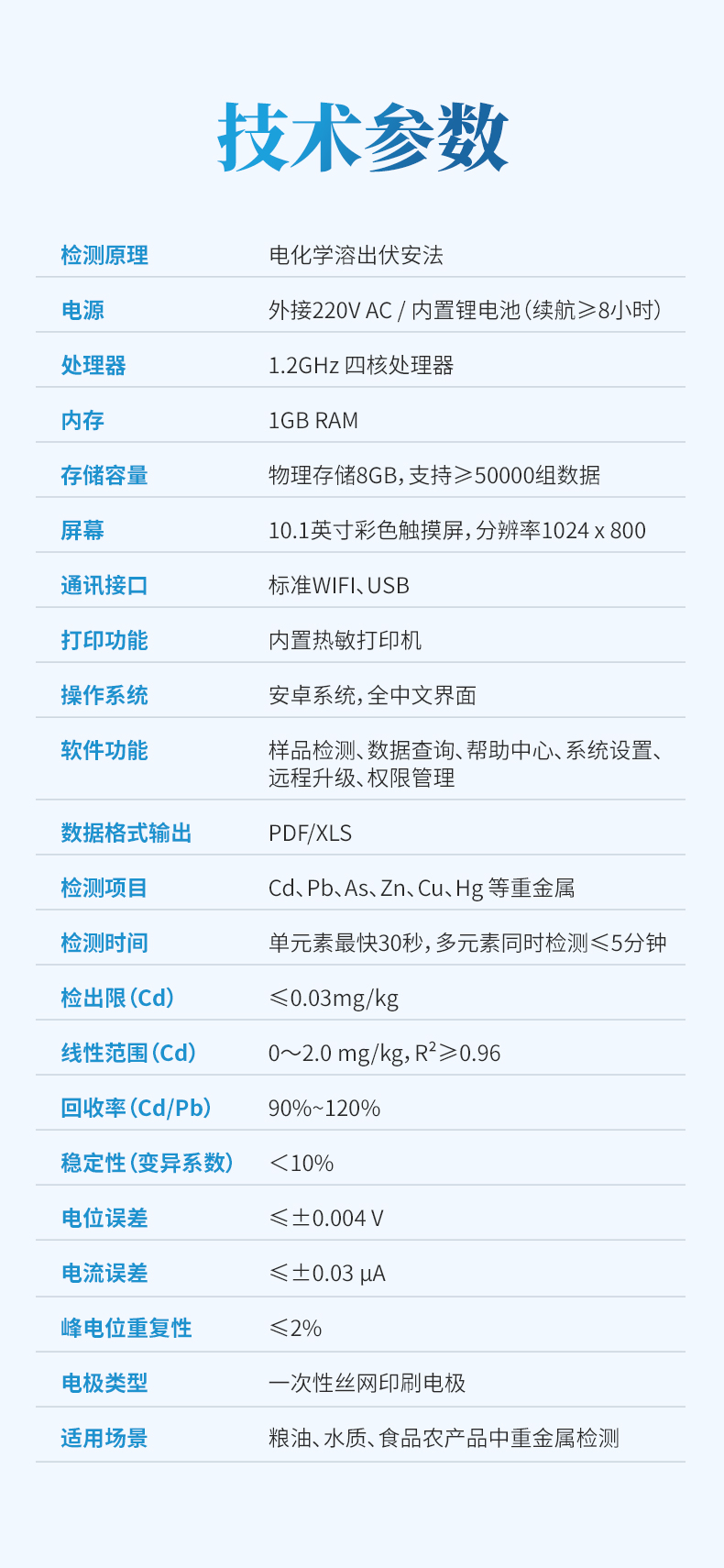 11、測試時間:篩查,單元素≤4分鐘;準(zhǔn)確定量,單元素≤9分鐘。鉛、鎘可同時檢測;