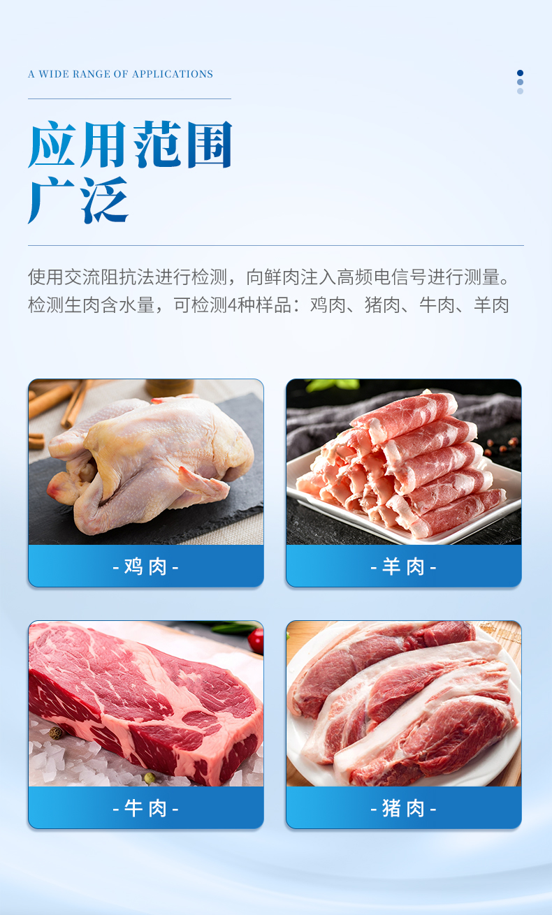 檢測生肉含水量,可檢測4種樣品:雞肉、豬肉、牛肉、羊肉。