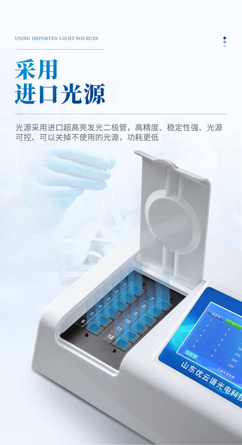 5、光源采用進(jìn)口超高亮發(fā)光二極管,高精度、穩(wěn)定性強(qiáng)、光源可控、可以關(guān)掉不使用的光源,功耗更低。