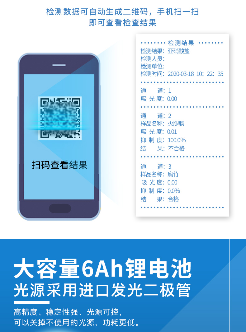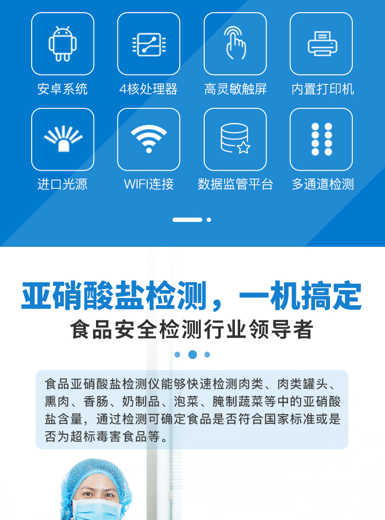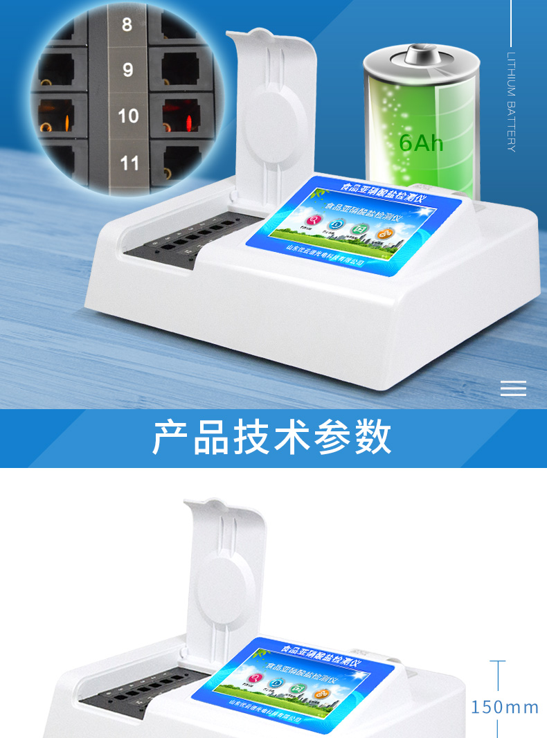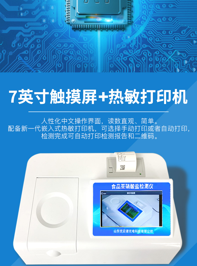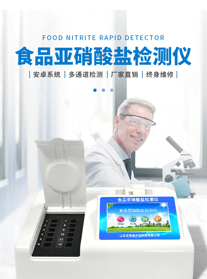 YP-Y12食品中亞硝酸鹽快速檢測儀為集成化食品安全檢測分析設(shè)備,能夠快速檢測肉類、肉類罐頭、熏肉、香腸、奶制品、泡菜、腌制蔬菜等中的亞硝酸鹽含量;該儀器是根據(jù)GB5009.33-2010《食品中亞硝酸鹽與硝酸鹽的測定》,食品中的亞硝酸鹽經(jīng)過提取,與檢測試劑反應(yīng)生成有色化合物,再利用亞硝酸鹽檢測儀測定其吸光度,在一定范圍內(nèi)吸光度與含量成正比。通過檢測可確定食品是否符合國家標(biāo)準(zhǔn)或是否為超標(biāo)毒害食品等。儀器預(yù)留其他項(xiàng)目檢測程序和端口,根據(jù)日后需求可方便的自主增加檢測項(xiàng)目。日后可升級為檢測水產(chǎn)品、面制品的綜合類型儀器。