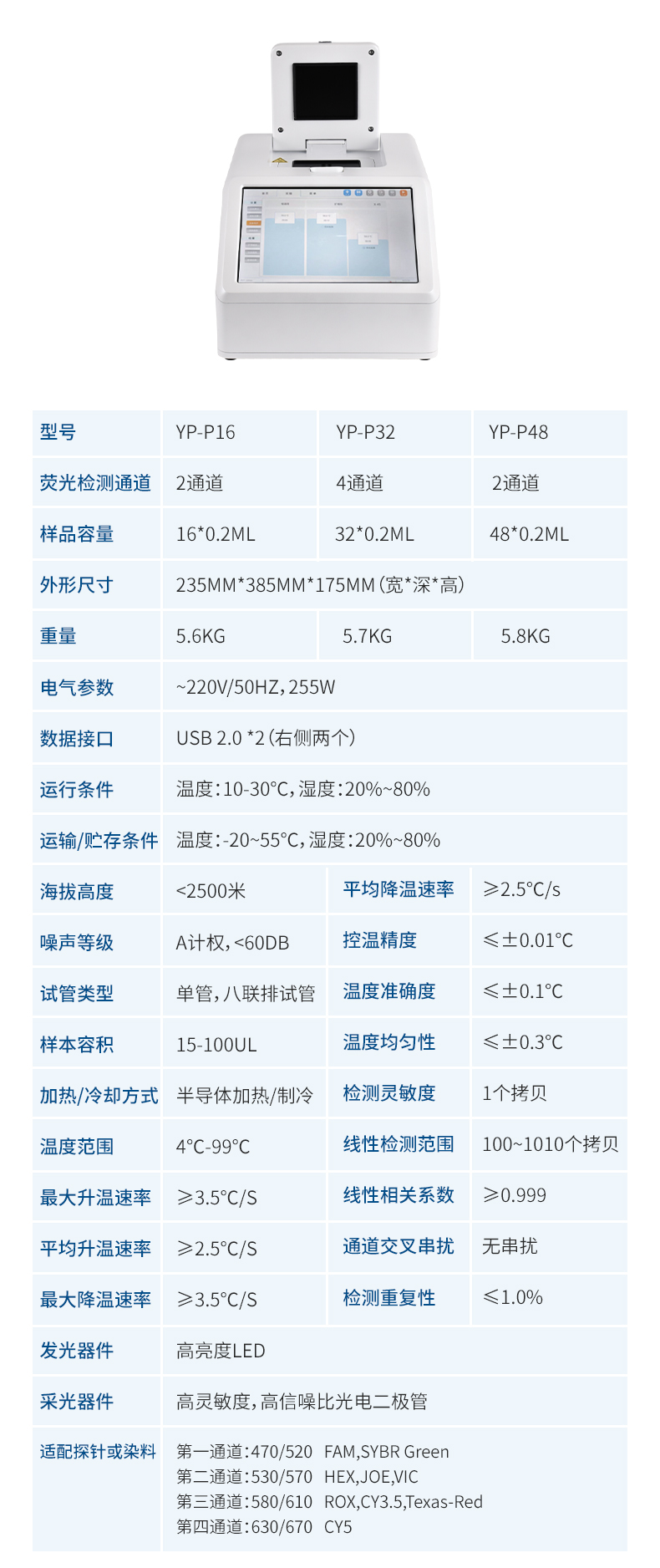 適用染料和探針:FAM/SYBR Green I, VIC/HEX/CY3(選配), ROX/Texas Red(選配), Cy5,TAMARA(選配)